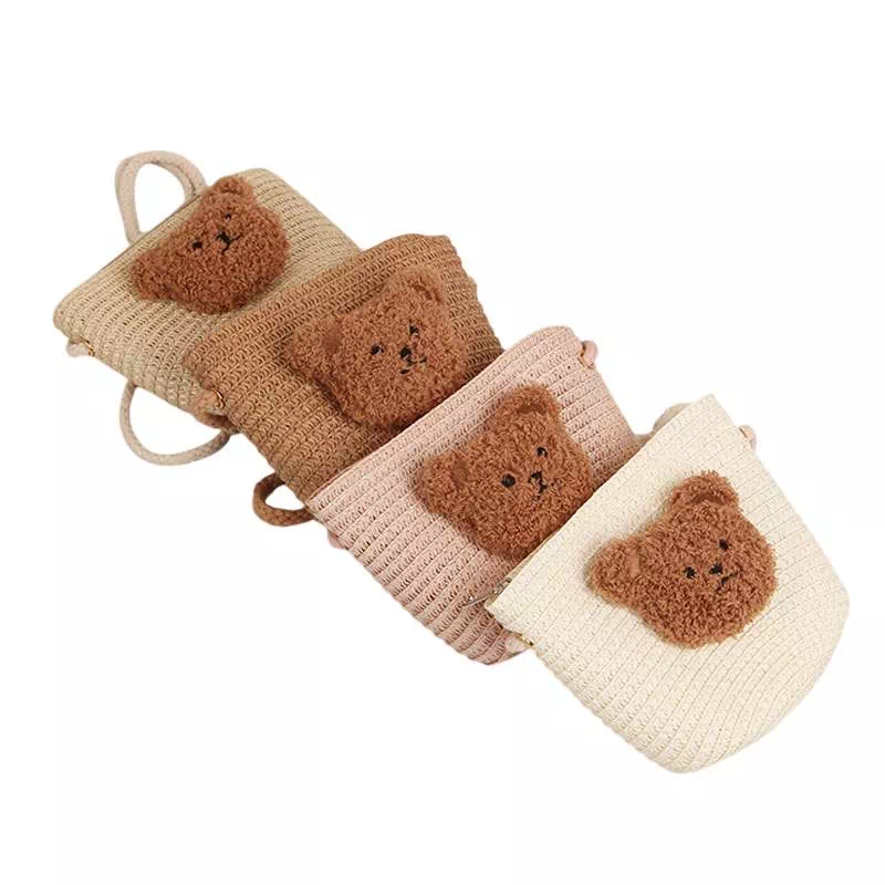 Söt liten handväska med björnhuvud för flicka. Charmig axelväska i virkstil med ett mjukt nallehuvud framtill. Perfekt för små händer. Lätt, säker med dragkedja och finns i flera färger.