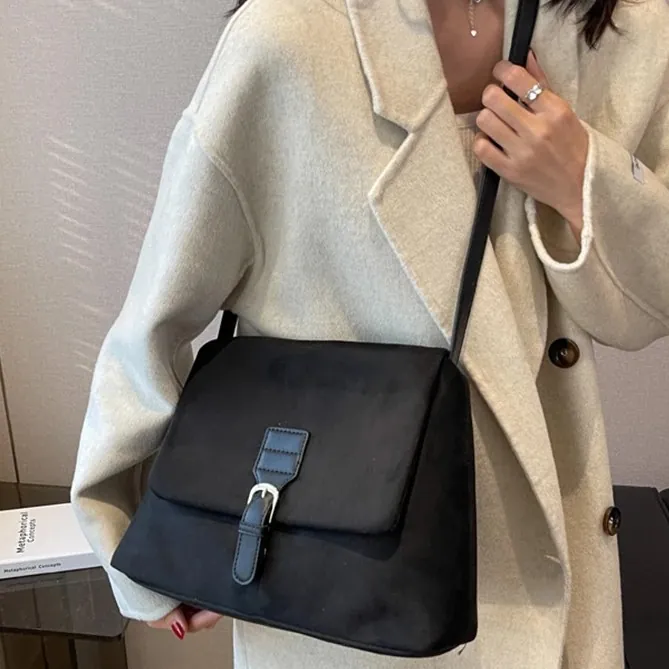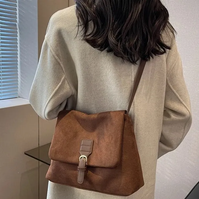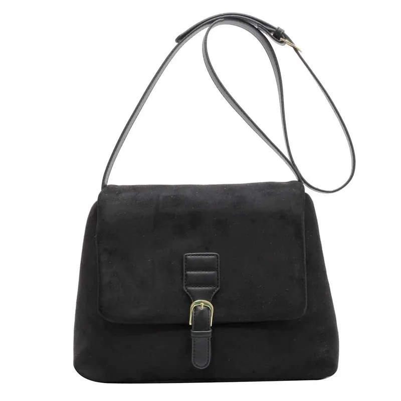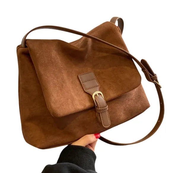 Trendig handväska mocka i mjuk PU med justerbar axelrem. Enkel att bära och passar perfekt till både vardag och stad. Den eleganta spänndetaljen ger väskan en modern och feminin stil.