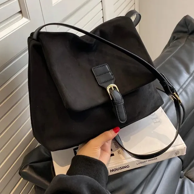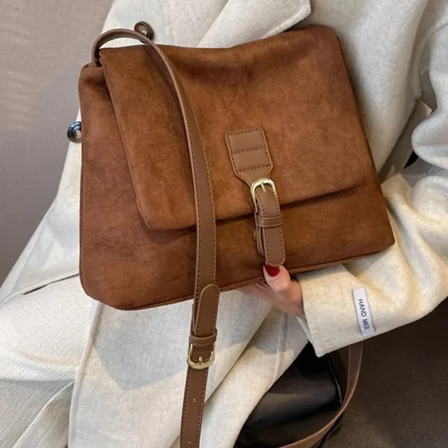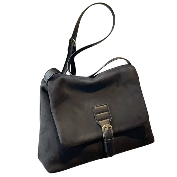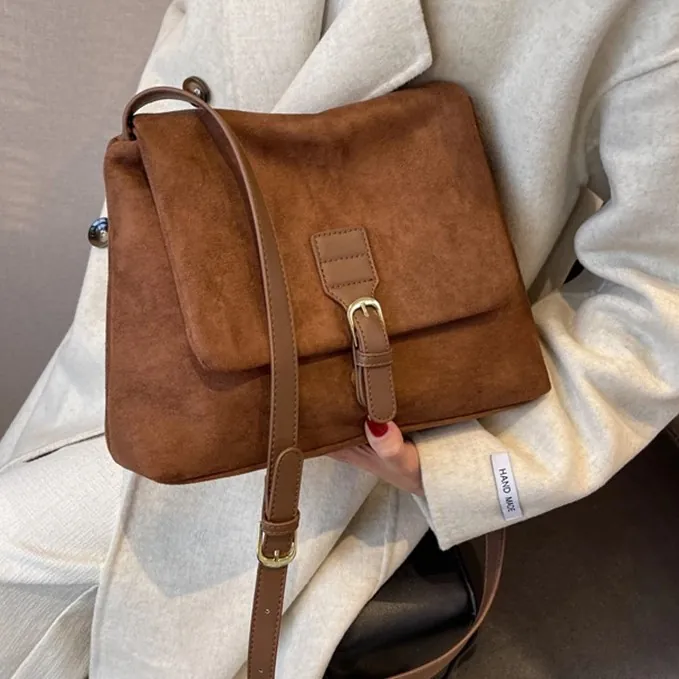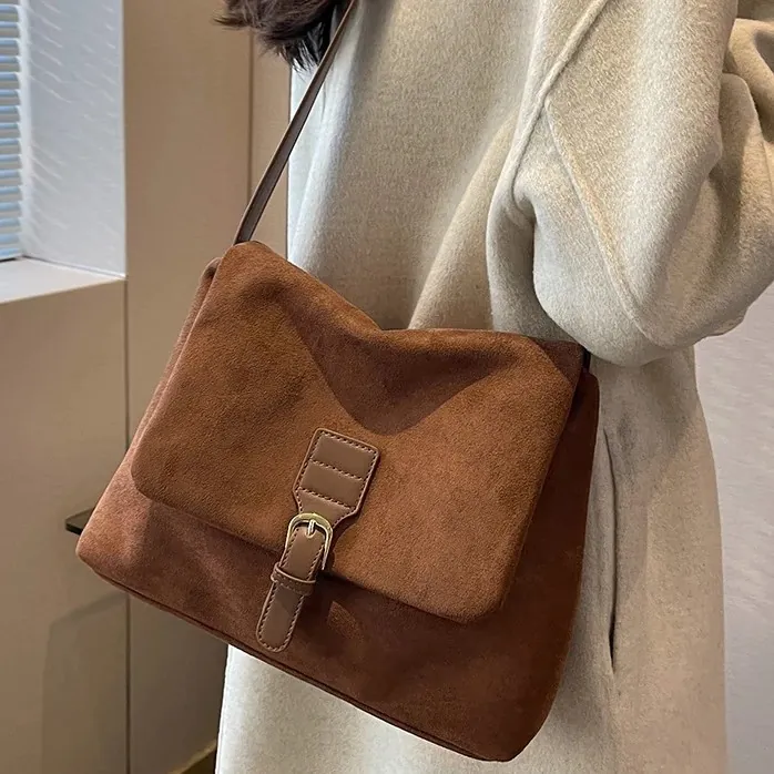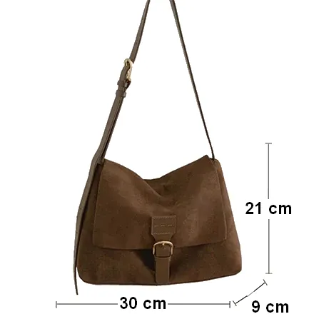 Denna handväska mocka kombinerar struktur och mjukhet i ett balanserat uttryck. Materialet i konstmocka känns behagligt och apporterar ett exklusivt intryck. Den justerbara remmen gör väskan lätt att bära över axeln, medan metallspännet framtill tillför en elegant detalj.