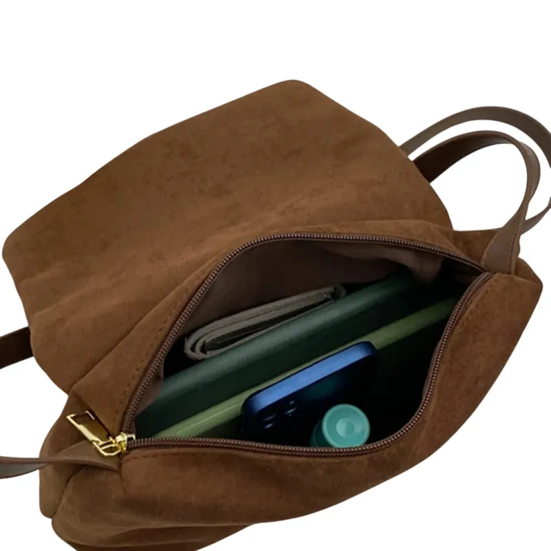 Spännet i guldton skapar kontrast mot den varma mockaytan. Väskan passar utmärkt till kappa, stickad tröja eller jeansjacka för en trendig look. Denna modell är ett pålitligt val för arbete, fika eller en dag i stan – enkel, feminin och alltid aktuell.