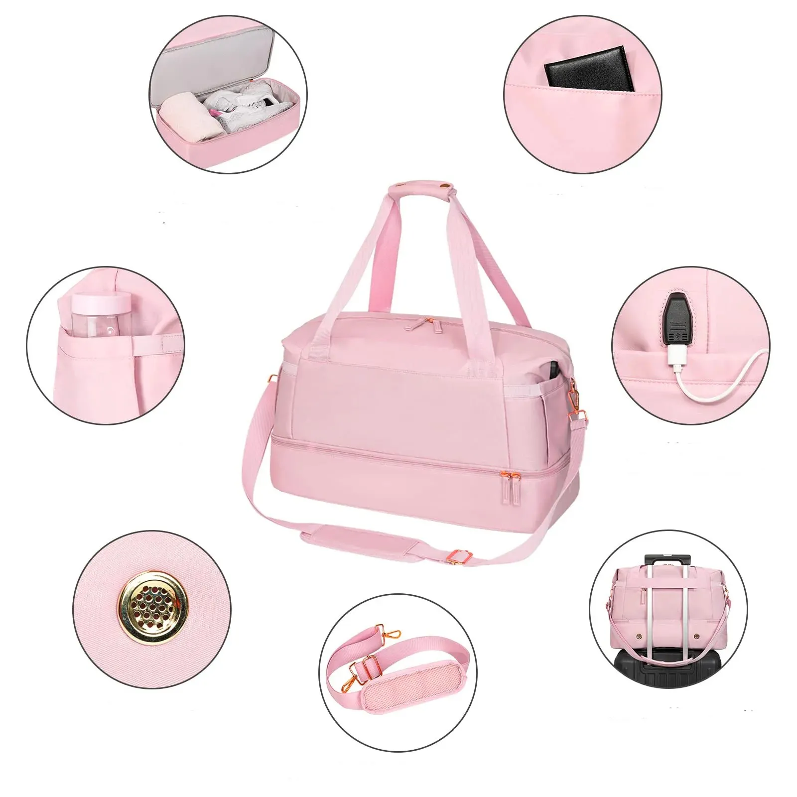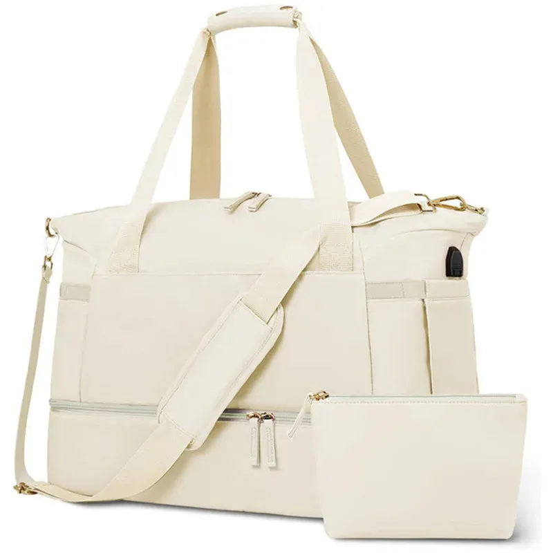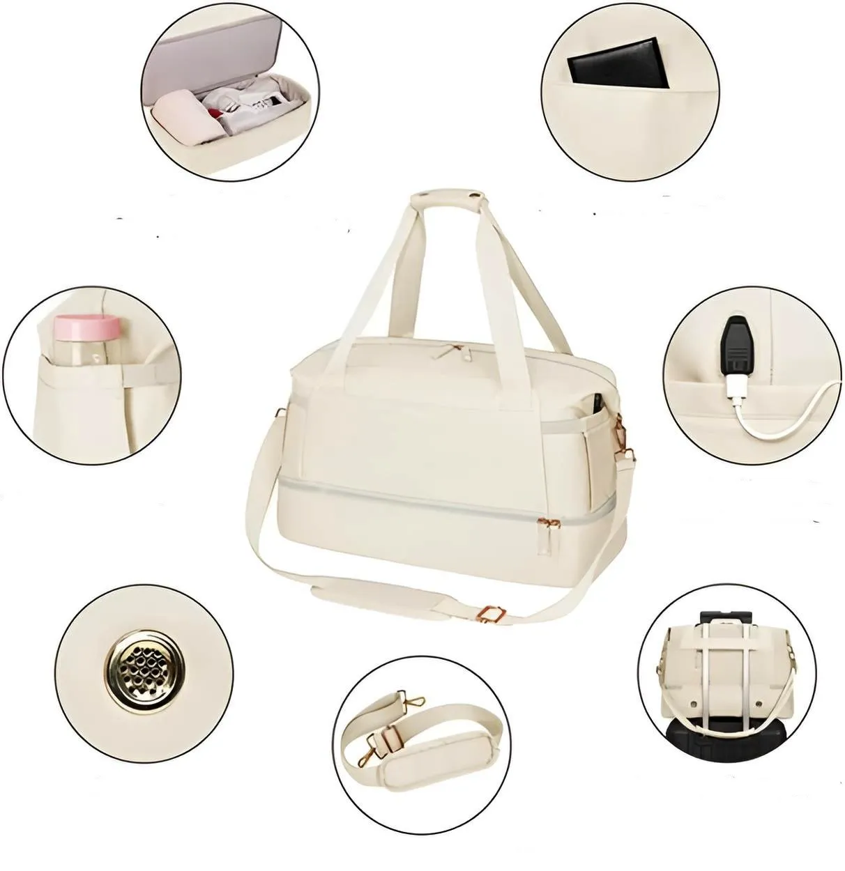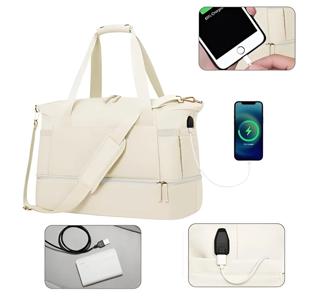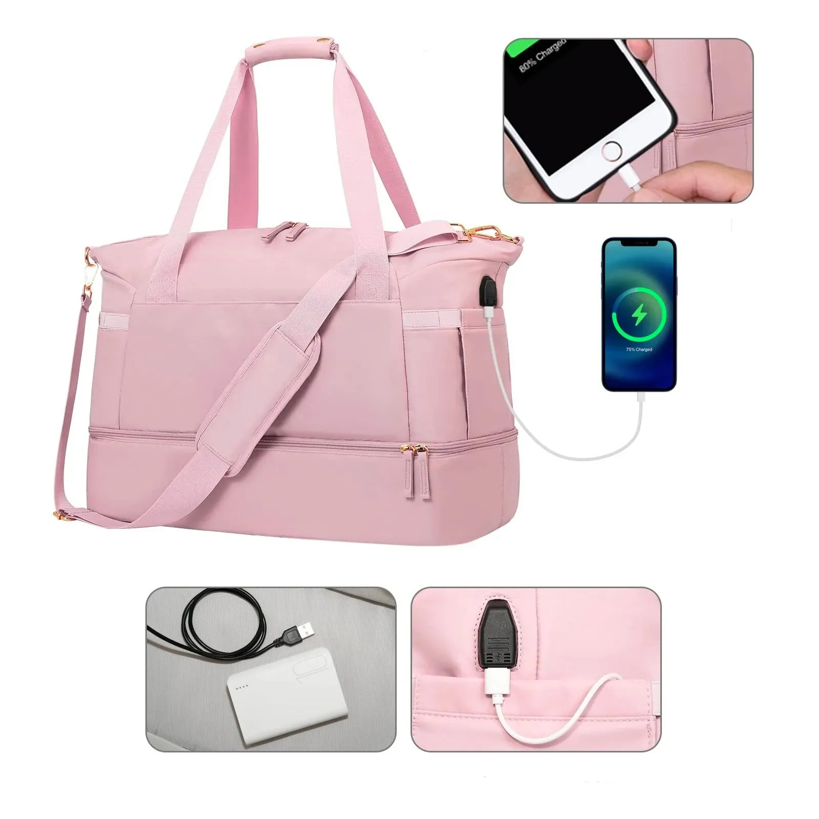 Ett modernt sportväska dam med integrerad USB-port. Du kan alltså ladda mobilen under resan. Designen gör väskan idealisk som handbagage, träningsväska eller helgresa. Oxford-tyget är vattentåligt och starkt. Den matchande necessären gör organiseringen enkel.