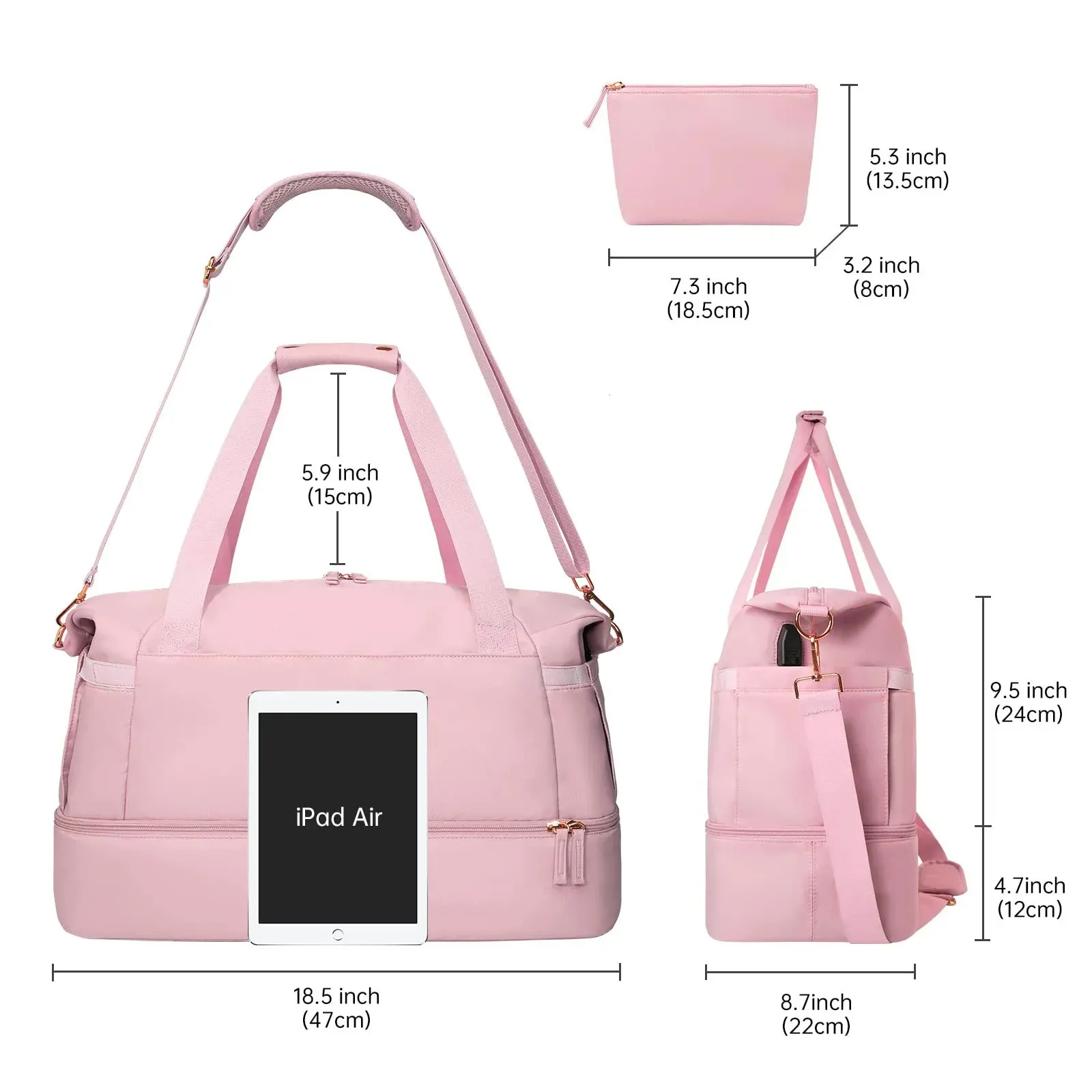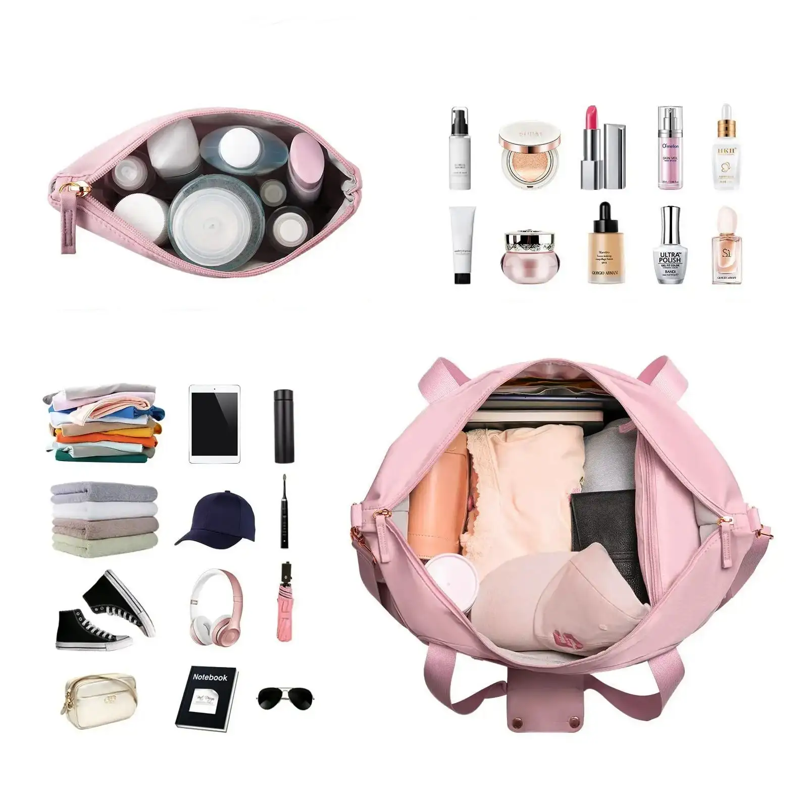 Detta resväska dam rymmer 35 liter och ger plats för kläder, kosmetik, elektronik och accessoarer. Insidan har två små fickor och ett huvudfack med dragkedja. Ett separat vått fack med PVC-beläggning håller handdukar och badkläder åtskilda.