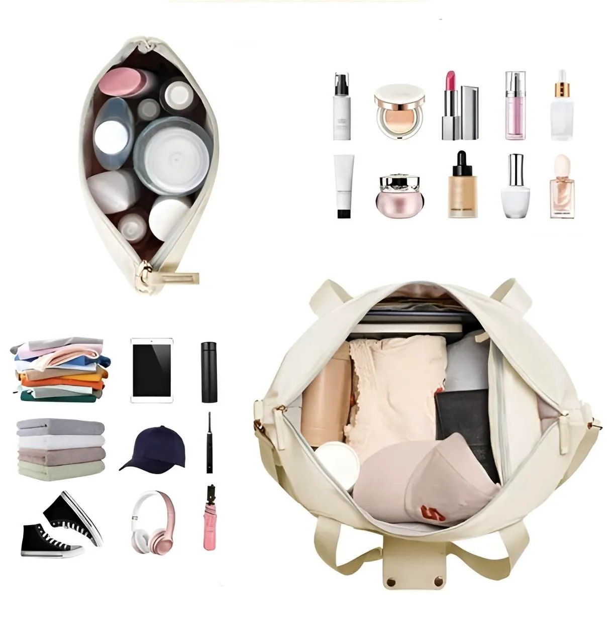 Denna stor axelväska för dam med matchande necessär kombinerar stil och funktion. Tillverkad i slitstarkt Oxford-material med PVC-beläggning. Volym 35 liter, vikt 775 g. Mått 47 x 36 x 22 cm. Rymlig insida, flera fickor, separat fack för våta kläder. USB-port för enkel laddning.