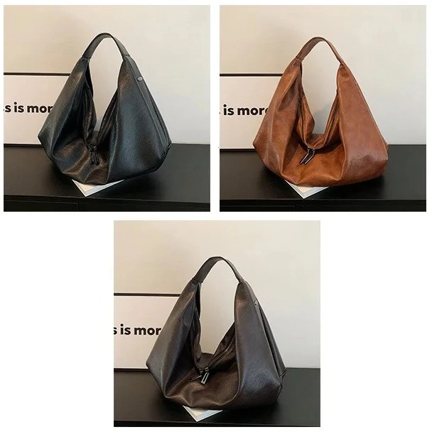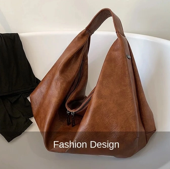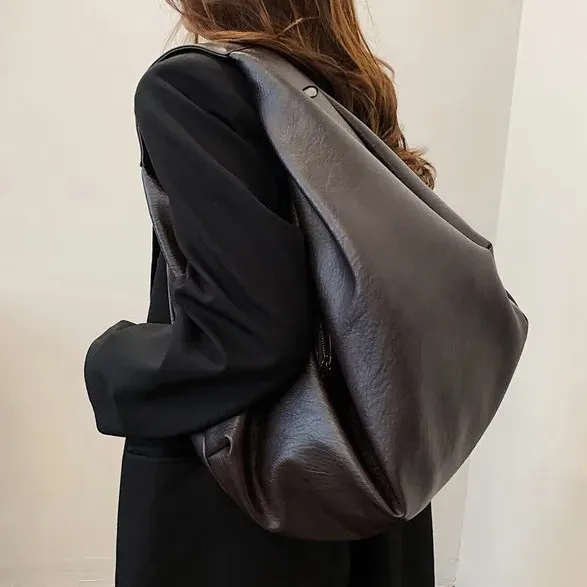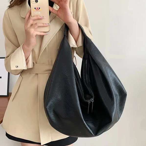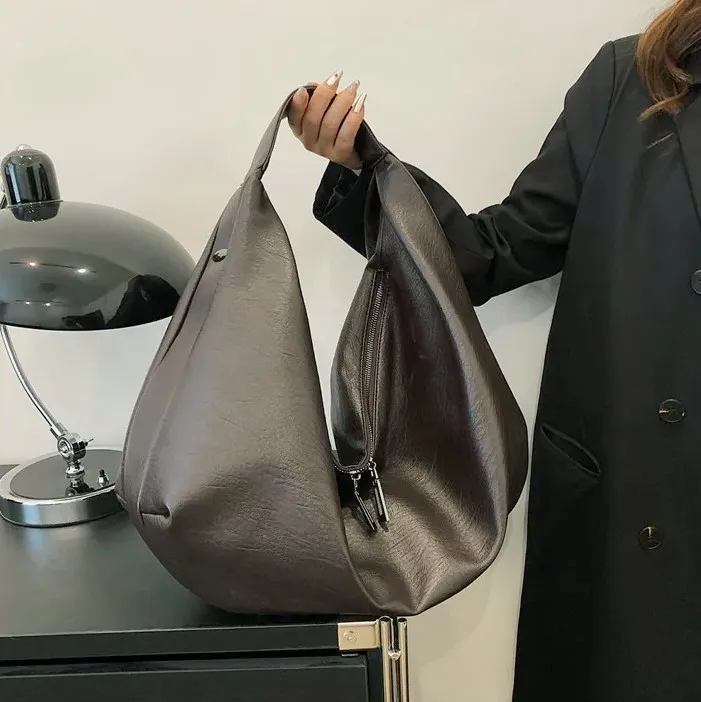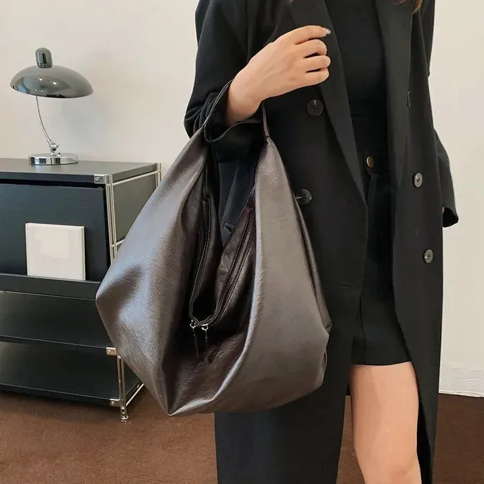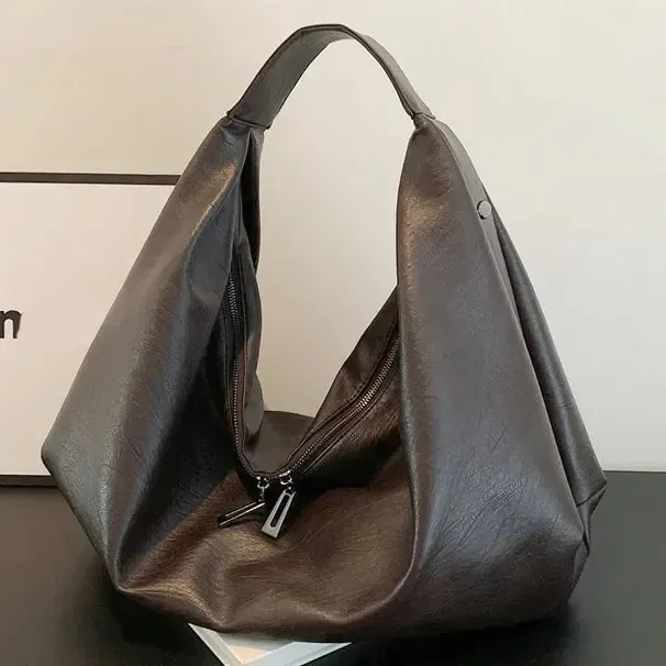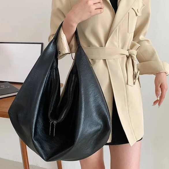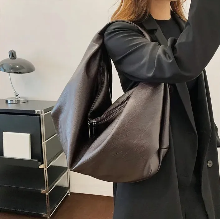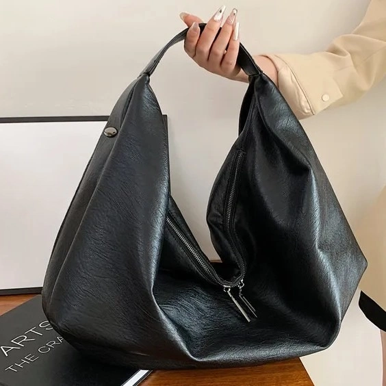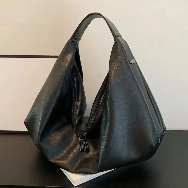 Elegant svart shopperväska i PU-läder, triangulär design med bred öppning och dubbla dragkedjor, perfekt för vardagens behov.
