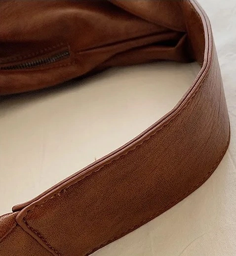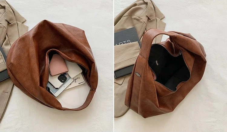 Rymlig brun shopperväska i PU-läder med mjuk struktur och modern form, stilren accessoar för både arbete och fritid.
