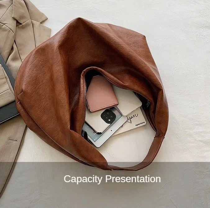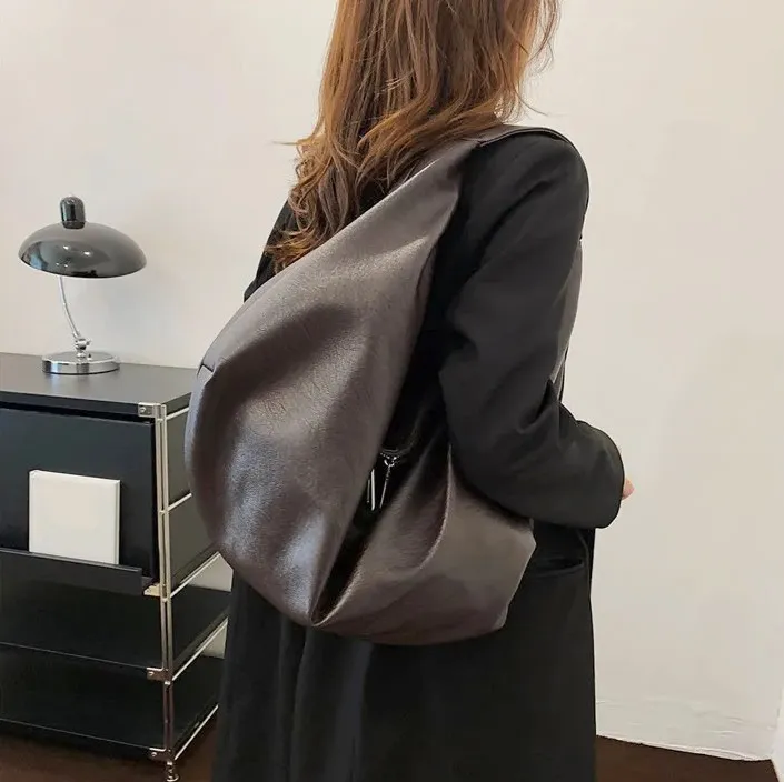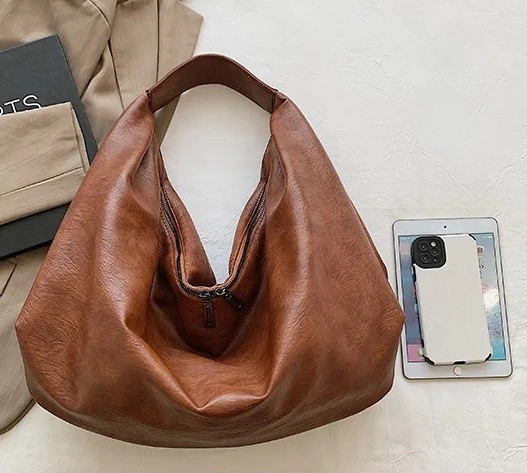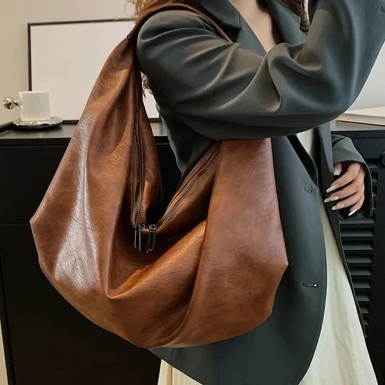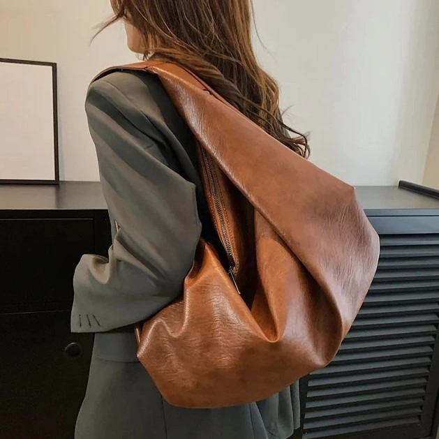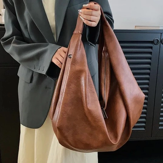 Rymlig brun shopperväska i PU-läder, bärs över axeln, kombinerar praktisk storlek med sofistikerad design.