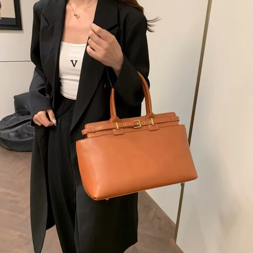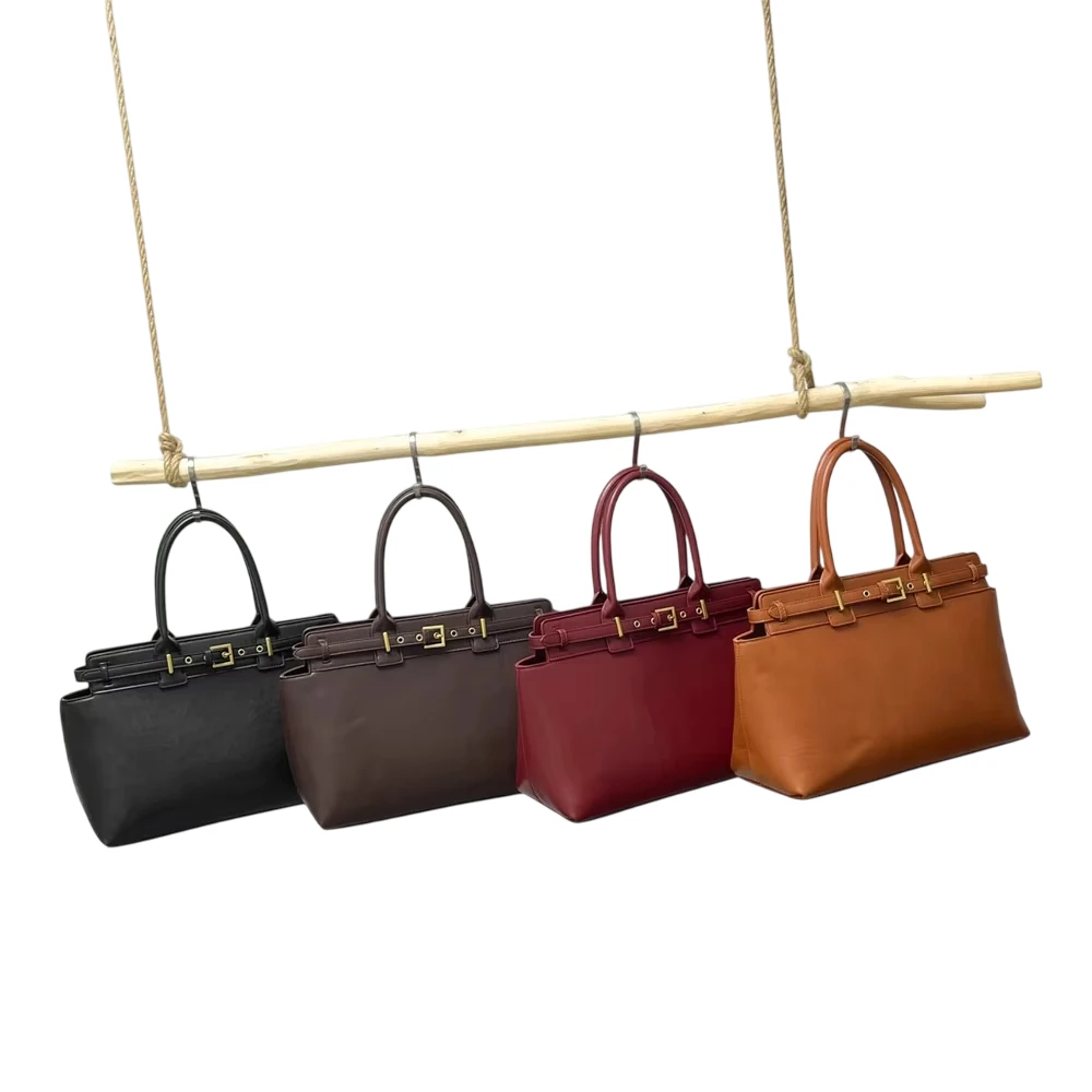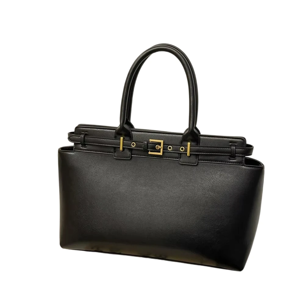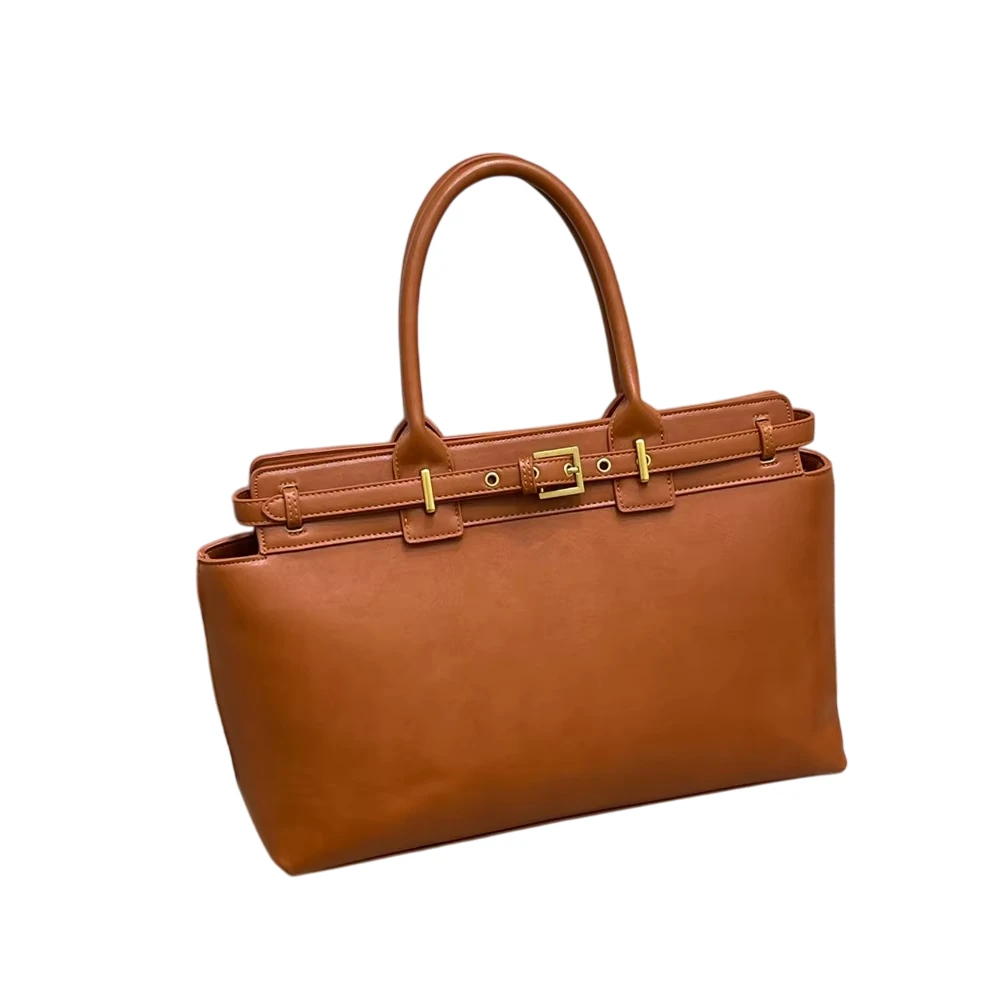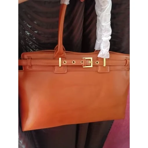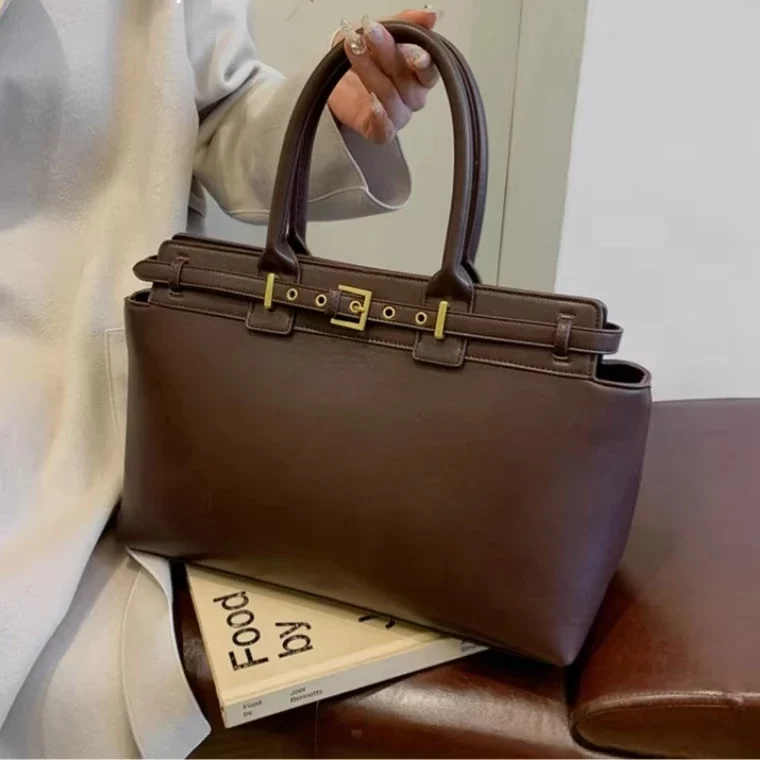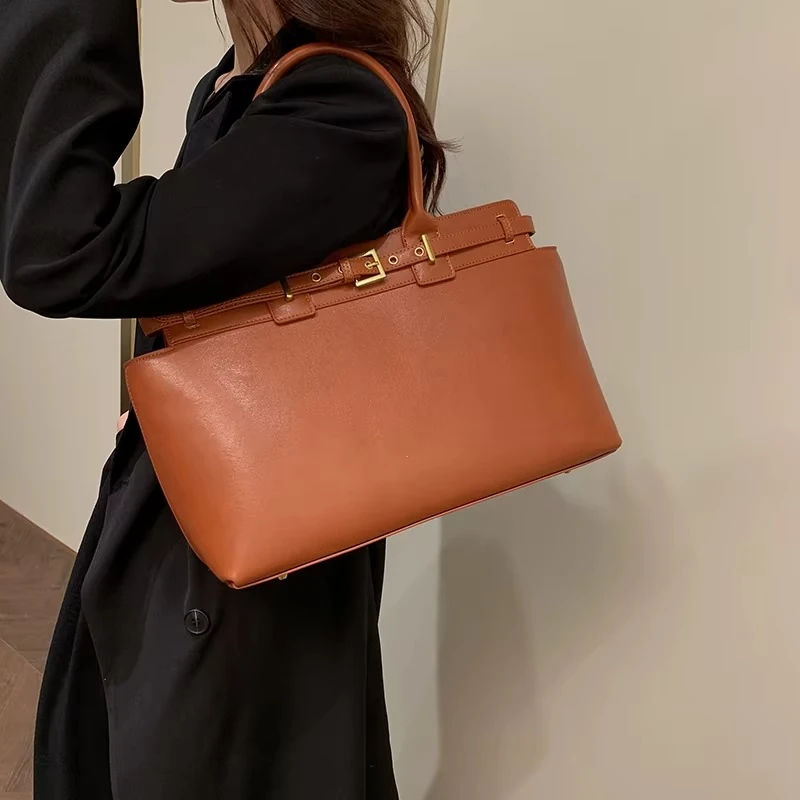 Denna stor handväska dam kombinerar klassiskt formspråk och funktion. Modellen har två stabila handtag och ett dekorativt bälte som framhäver dess vintage handväska-karaktär.
