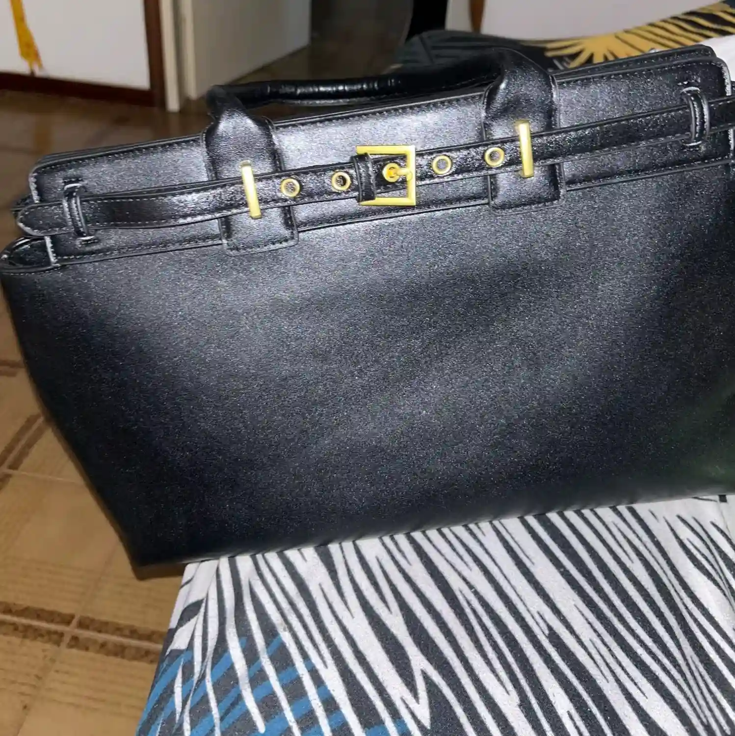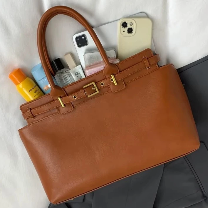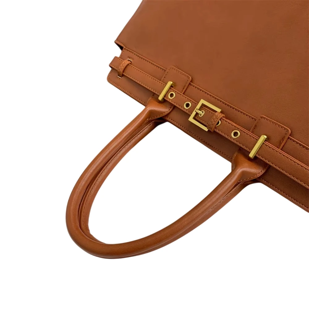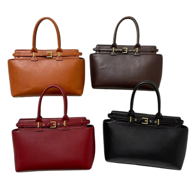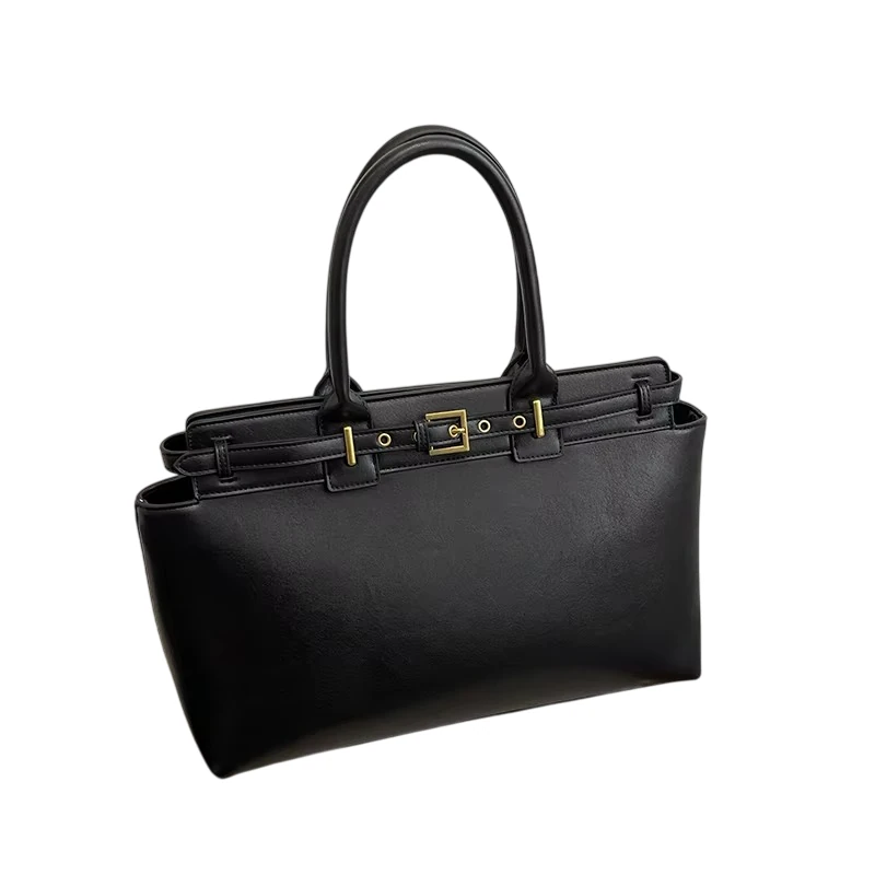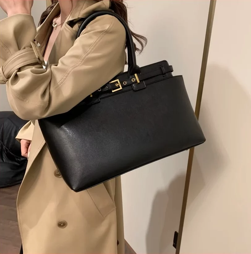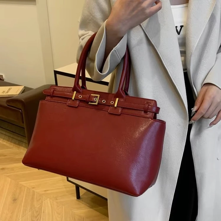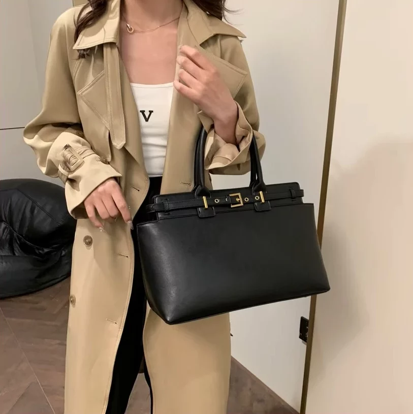 Denna stor handväska dam kombinerar klassiskt formspråk och funktion. Modellen har två stabila handtag och ett dekorativt bälte som framhäver dess vintage handväska-karaktär.